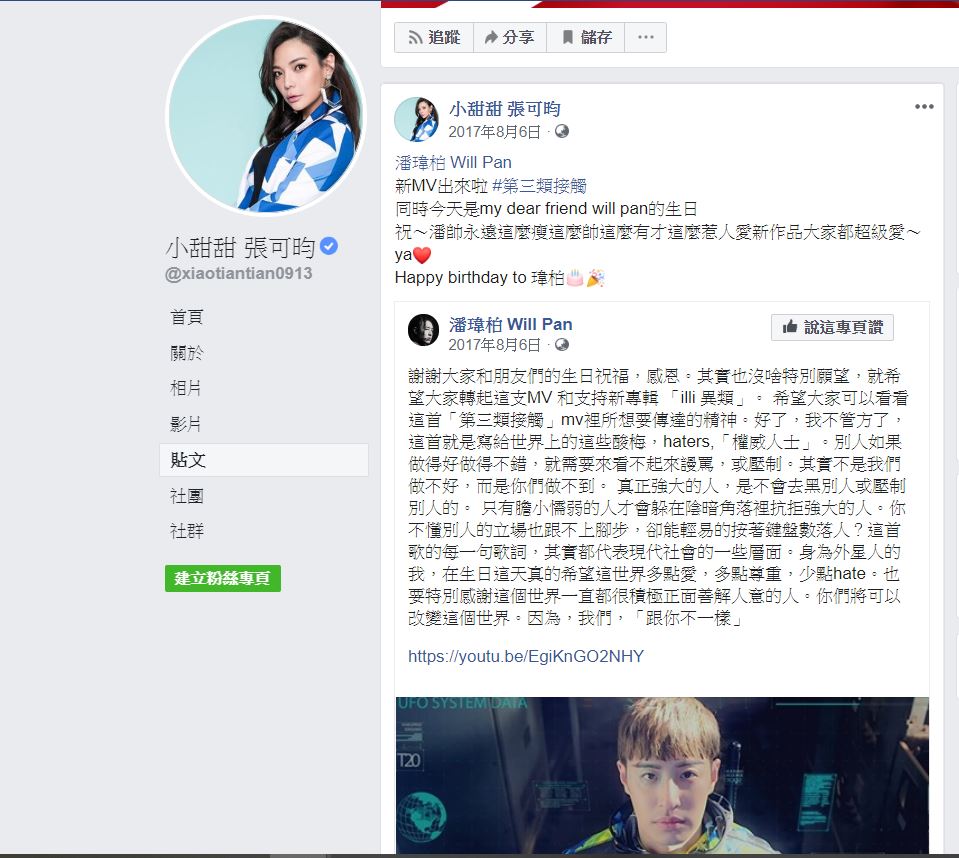 兩人之間的情誼,其實也不難觀察,儘管「潘瑋柏」近幾年都在中國發展居多,但兩人仍時不時地幫對方做宣傳,為對方打氣加油,「潘瑋柏」在自己的粉絲專頁上幫「小甜甜」宣傳新書,而「小甜甜」也幫著「潘瑋柏」打歌做宣傳,足見兩人交情深厚。