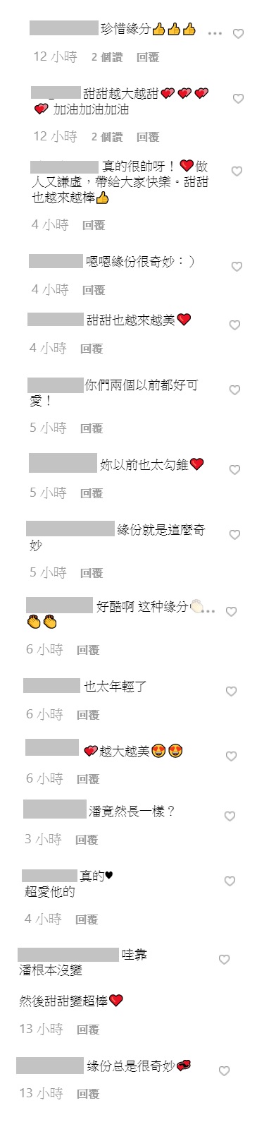 而網友們也在看見兩人的青澀合照後,紛紛留言表示「甜甜也越來越美」「你們兩個以前都好可愛!」「緣份就是這麼奇妙」,更有不少網友驚嘆「潘竟然長一樣?」「哇靠!潘根本沒變」,大感歲月完全沒在「潘瑋柏」身上留下痕跡。