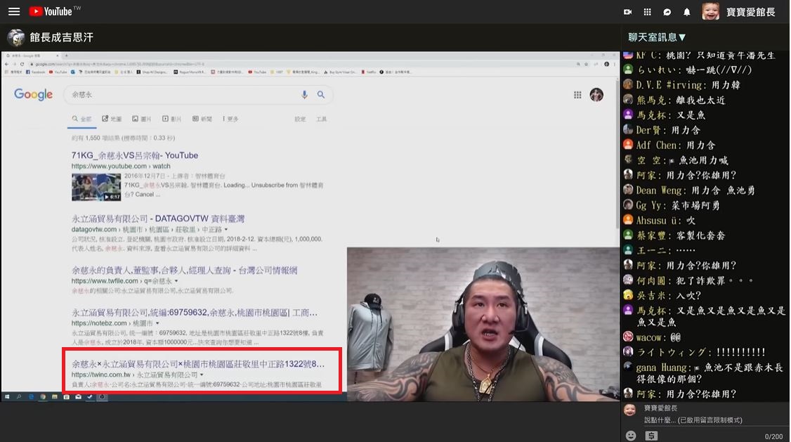 而這也讓「館長」決意不再縱容這樣的「詐欺犯」,因此向「余慈永」提出告訴。館長在直播中也十分氣憤地表示,「他在今年的三月還四月份就被我告了…我一定要把這種人公諸在全世界給各位看看」。接著便公開了「余慈永」相關的公司資訊,此外,還憤恨不平的提到,因為這位「余慈永」的詐欺行為,在外積欠千萬債務,致使記者朋友找上他,欲詢問相關細節,讓他不勝其擾,隨後「館長」更坦言「這件事情我也是苦主」。