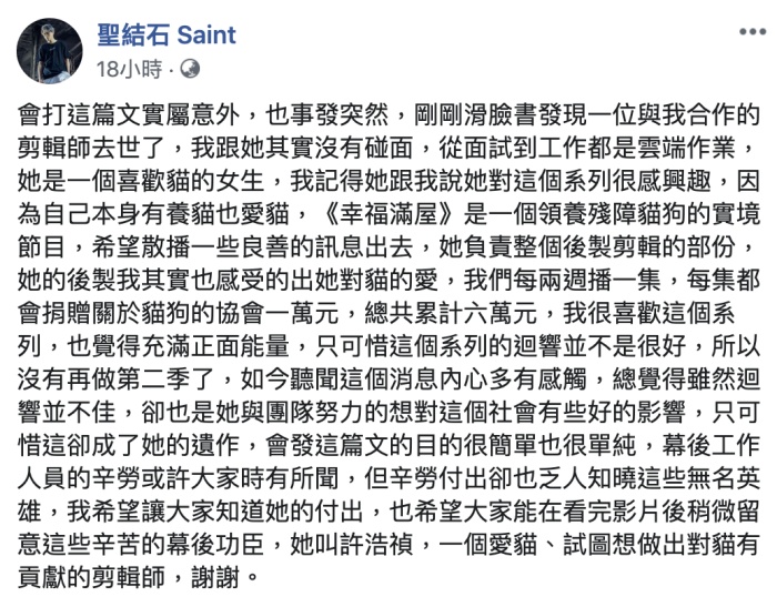 聖結石的頻道中,曾有一個領養殘障貓狗的實境節目《幸福滿屋》,期盼能散播一些良善的訊息。今(4)天聖結石發現該節目合作的剪輯師已經去世,因此打了一篇長文來謝謝該剪輯師。