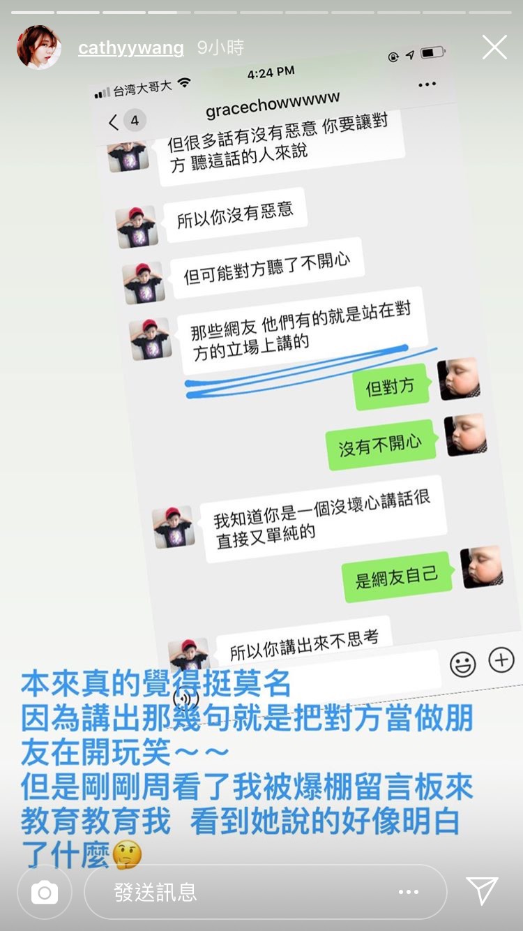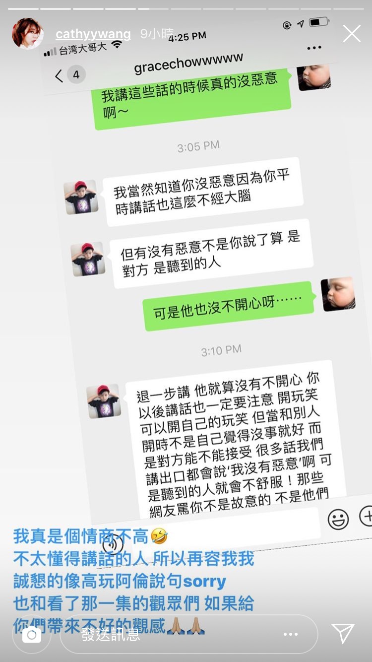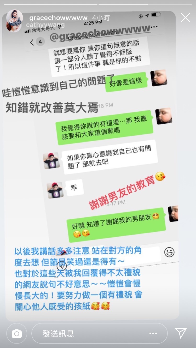 事後愷愷也在IG曬出和周揚青的對話,起初愷愷不斷強調自己沒有惡意,且對方也沒有不開心,不懂網友為什麼要這麼生氣,覺得自己被罵得莫名其妙,「因為講出那幾句就是把對方當朋友在開玩笑」。但周揚青解釋,不管有沒有惡意,「你這句無意的話讓一部份人聽了覺得不舒服了!所以這件事就是你的不對」、「你沒有惡意,但可能對方聽了不開心,那些網友他們有的就是站在對方的立場上講的」,愷愷才終於意識到自己的問題,也向大家道歉。