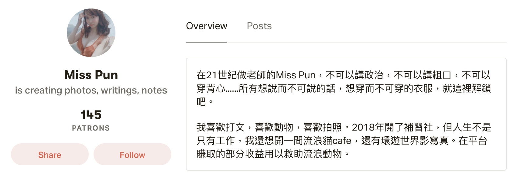 搣時潘在香港是一名專門教中文的補習班老師,同時她也開設YouTube成為小有名氣的網紅,除此之外她在營利網站Patreon開設一個帳號,該部落格的簡介也打著:「所有想說而不可說的話,想穿而不可穿的衣服,就這裡解鎖吧」,搣時潘會在付費部落格中放上許多大尺度的生活照,舉凡「性感睡衣姐妹裝」、「姊妹酒店床上照」、「浴缸全裸照」等都需要付費才能解鎖。