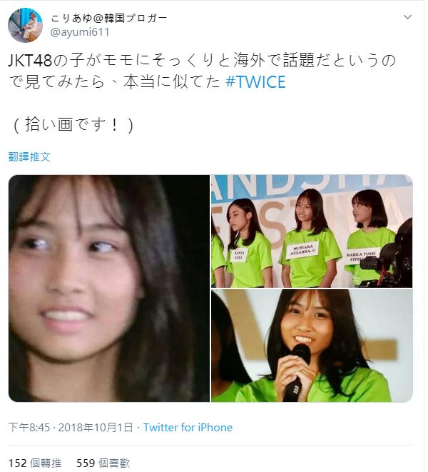 除了兇版Momo,過去也有一名來自印尼的練習生Mutiara Azzahra,出身自日本大型女團AKB首支海外分隊JKT48,面對鏡頭靦腆微笑的模樣甚至被不少網友誤認是Momo的童年照,甚至有網友笑稱Mutiara Azzahra是「曬黑版的Momo」,只能說Momo的高人氣也意外讓不少長相神似的人受到關注。