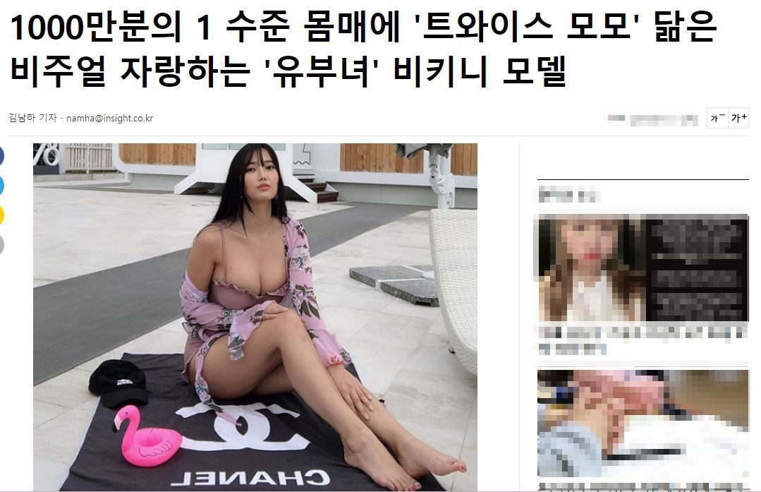 女團TWICE日籍成員Momo作為團中吃貨卻始終保有姣好身材,時常能在上班路上看見他穿著展現好身材的火辣穿搭,而近期就有一名韓國網紅Vicky(썬비키)其IG帳號為ssunbiki,因為長相神似Momo卻擁有驚人乳量被外界稱是「兇版Momo」,更登上韓國當地新聞而蔚為討論。網紅Vicky的外貌和Momo一樣擁有渾圓的大眼睛,此外高高的顴骨是兩人的共通點,也都擁有嫩白的好膚質,雖然Momo本身就有健美身材,不過網紅Vicky不管是上圍或是身型幾乎都比Momo本尊大上許多。