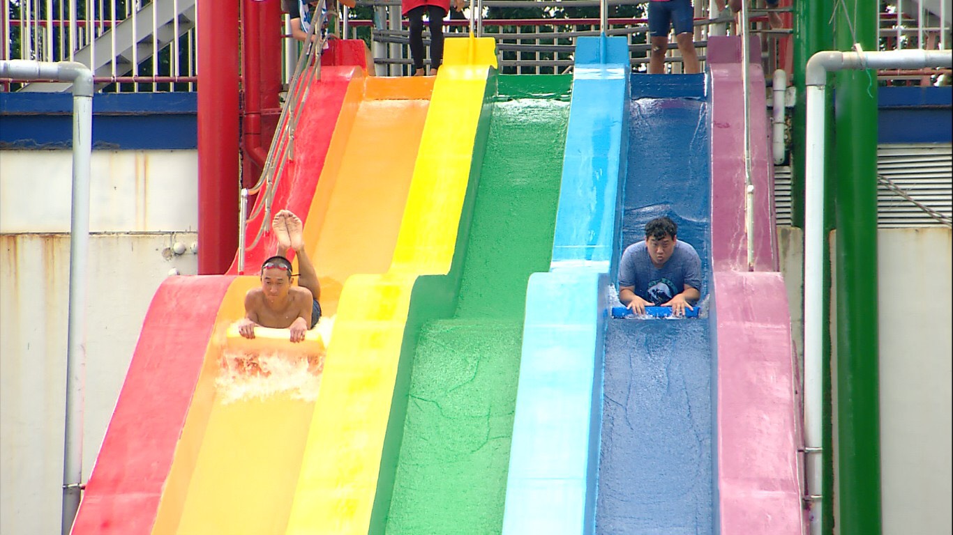 接著第二關卡來到大型滑水道游泳池,由浩子對上阿龐,在超長滑水道直衝而下比滑行的距離,原本以為身形輕盈像是打水飄的浩子會滑得比較遠,最後竟然由「重力加速度」理論的阿龐取得最終勝利,讓阿龐平反說「我也是有在衝浪的!」