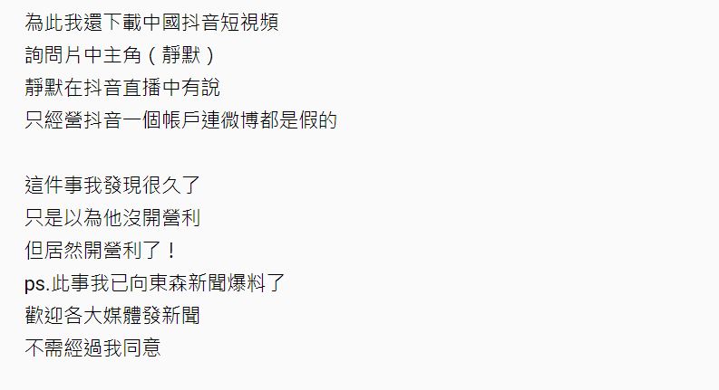 網友進一步指稱,其實自己已經發現很久了,當時還特別辦了抖音的帳號詢問創作者本人,而當時創作者在抖音直播中提及「只經營抖音一個帳戶,連微博都是假的」,確定YouTube和FB都並非本人經營,而網友之前一直以為對方沒有開營利,所以睜一隻眼閉一隻眼,但在發現對方開了營利之後決定爆料。而目前被爆料的FB、Youtube仍未有刪除動作,也尚未有其他網友抗議其「搬運行為」。