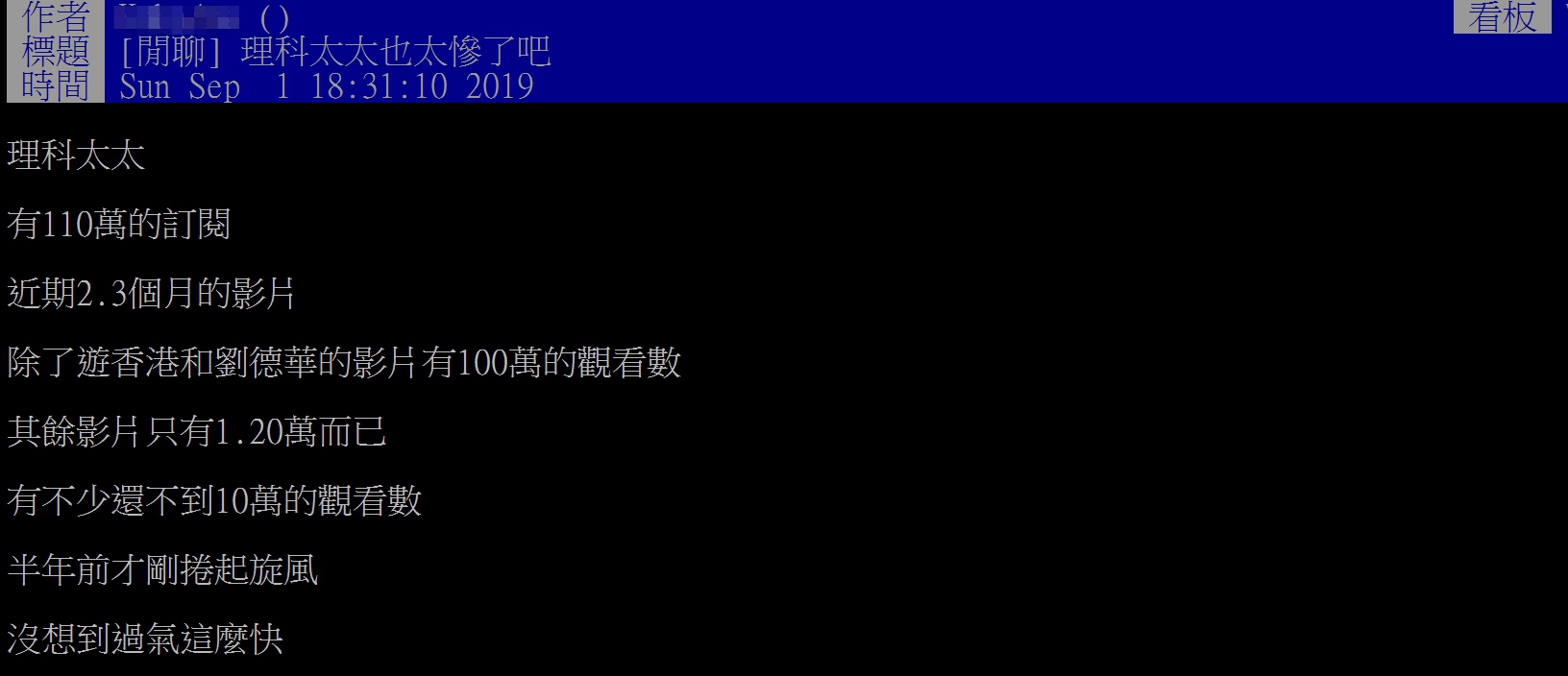 理科太太以冷靜直率風格走紅,她的用詞一針見血、精準犀利而廣受網友喜愛,頻道有超過百萬訂閱,但有網友發現,理科太太頻道的訂閱數和影片觀看數不成正比,因此在「PTT」上發表文章表示「理科太太也太慘了吧」,原PO感慨「近期2、3個月的影片,除了遊香港和劉德華的影片有100萬的觀看數,其餘影片只有1、20萬而已,有不少還不到10萬的觀看數,半年前才剛捲起旋風,沒想到過氣這麼快,理科太太也太慘了吧」,對比之前幾乎每部片都會破50萬的觀看人次的情景,似乎光環消失。
