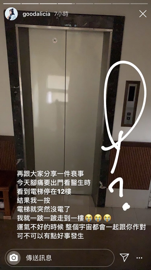 沒想到不只工作的事不如意,連生活也是各種不順利,甚至連身體狀況都出問題!愛莉莎莎昨天在限時動態中提到,自己的韌帶拉傷,要出門看醫生時電梯又壞掉,只能一跛一跛地走到一樓,直呼「運氣不好的時候,整個宇宙都會一起跟你作對!」。
