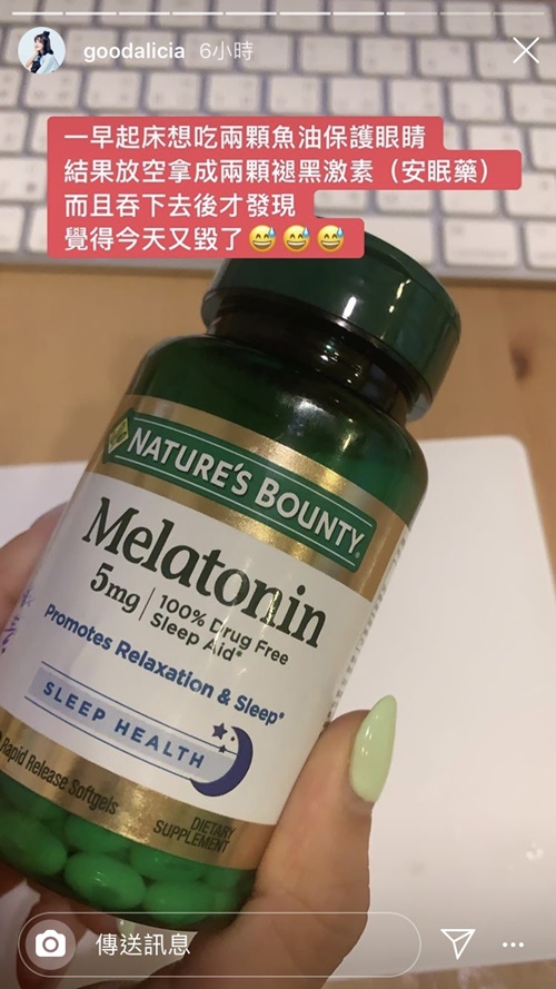 好不容易過完衰事連連的一天,愛莉莎莎今天一大早又雷到自己,原本想吃魚油保護眼睛,沒想到一放空竟拿成「褪黑激素(安眠藥)」,而且她在吞下去後才發現吃錯藥,讓她無奈地說,「覺得今天又毀了」。