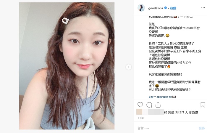 愛莉莎莎日前在Instagram上表示,自己辛辛苦苦錄製的影片,明明沒有腥羶色也被「貼黃標」,目前已經連續兩個禮拜的影片都是同樣情況,付出的努力全白費,讓她十分憂鬱。