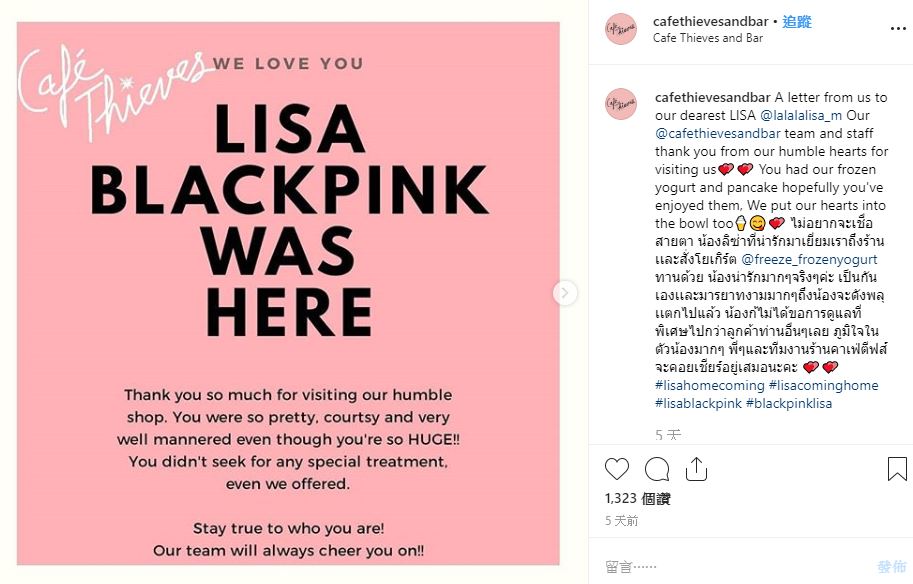 韓國女團BLACKPINK泰籍成員Lisa因為擁有傲人的身材比例,渾圓大眼和挺鼻更顯她的五官精緻,外界因而封她是「人間芭比」上月30日,Lisa繼巡迴演唱會後終於為了見面會再度返回家鄉泰國,更被目擊在某間咖啡廳的開幕日現身。根據咖啡廳店員在該店的官方IG指出,見過Lisa本人後大家都一致認證「超級正」,更有幸運在場的幸運粉絲拿出應援棒要求簽名,Lisa都來者不拒展現親民作風。