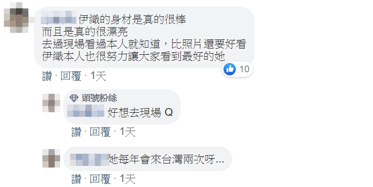 粉絲看到照片後紛紛大讚伊織萌的毅力,表示「伊織的身材是真的很棒,而且是真的很漂亮,去過現場看過本人就知道,比照片還要好看,伊織本人也很努力讓大家看到最好的她」、「好喜歡啊啊啊」、「身材怎麼變都很喜歡」,也有不少粉絲想一睹她本人的成果,詢問「什麼時候再來台灣」。