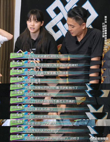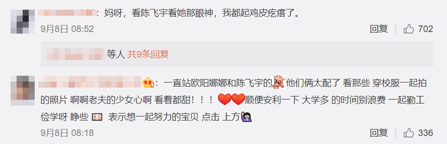 近日,歐陽娜娜在節目中談論理想型男友的時候表示,希望對方外表長得舒服、要高冷,但只對自己一個人好,並解釋「這個圈子看太多帥哥,帥哥不靠譜,我的話已經很多了,希望那個人聽我說話就好了」,條件一出,大批網友紛紛表示「就是陳飛宇」,並大讚兩人相當登對「get到了,莫名很配呢~~仔細一想~家世,學歷,愛好,年齡,身高,長相,還確實配~」、「媽呀,看陳飛宇看她那眼神,我都起雞皮疙瘩了」、「一直站歐陽娜娜和陳飛宇的,他們倆太配了,看那些穿校服一起拍的照片,啊啊老夫的少女心啊,看著都甜!!!」。