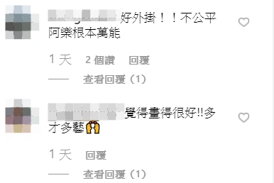 照片一出,馬上引來大批網友大讚她長得漂亮又多才多藝,不僅會音樂還會美術,紛紛留言表示「會音樂會畫畫,我開始覺得老天爺不公平了」、「好外掛!!不公平阿樂根本萬能」、「您媽媽此生最好的作品,肯定是妳」也有不少粉絲稱讚她十分努力「感覺小時候應該跟上班一樣累,學好多才藝」、「畫畫不是靠天份的老實說,沒有花個幾年時間天天沒日沒夜畫是畫不好的,想起學繪畫的日子⋯⋯恐怖」。