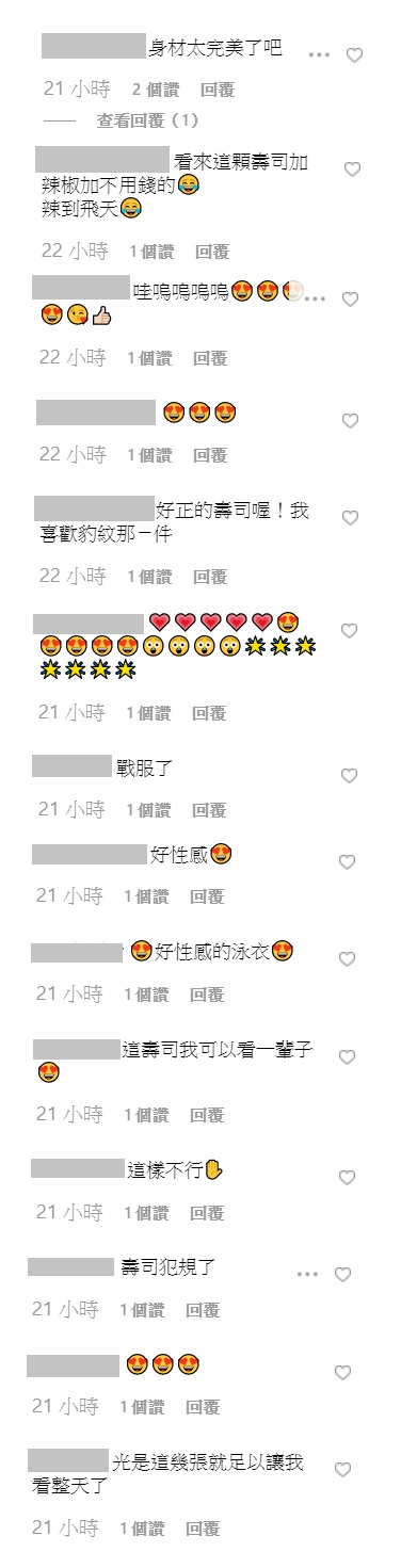 而這樣性感的比基尼照,自然吸引了許多粉絲的關注,更紛紛留言大讚「戰服了」「身材太完美了吧」「辣到飛天」「好正的壽司喔!我喜歡豹紋那ㄧ件」「好性感」,更有不少網友大呼「這樣不行」「壽司犯規了」,直稱「壽司」性感到令人不敢直視。