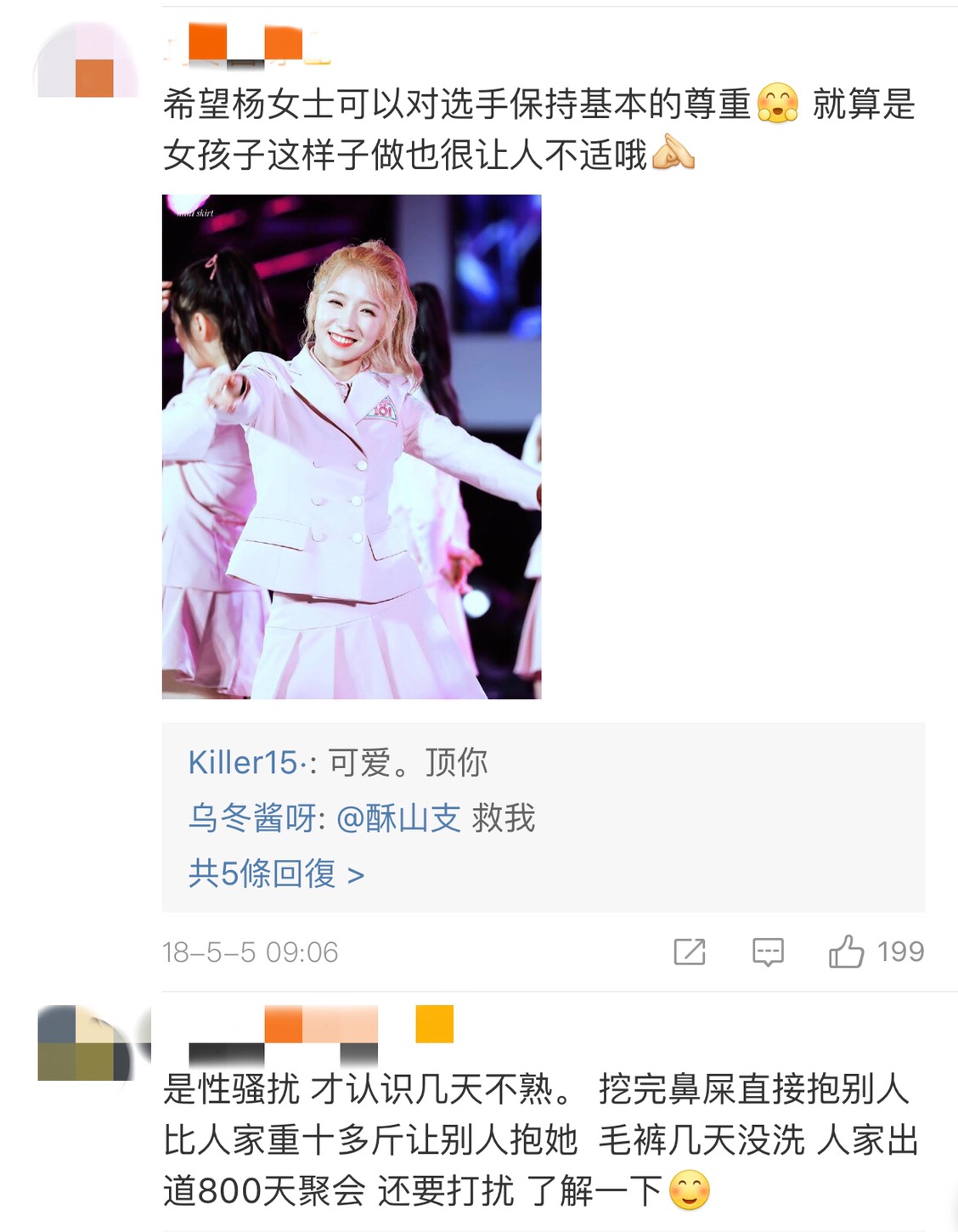 過去在火箭少女中也曾出現許多打鬧的襲胸,像是楊超越在節目上伸手拍了Sunnee的胸部就被追著一陣打,許多粉絲也都出面替成員們緩頰認為這只是女生在展現友好情誼的模式之一。