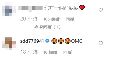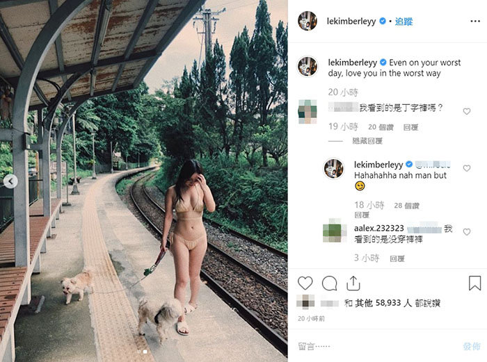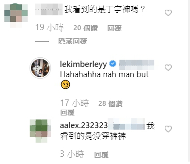 照片一出,馬上吸引大批網友留言稱讚「為什麼會穿這樣在這遛狗哈哈哈哈哈」、「可愛死了」、「你有一個好屁屁」、「OMG」、「喜歡妳的身材」,而因為她的屁股有些吃布,小褲被捲起不少,讓她的屁股曲線一覽無遺,導致有網友調侃:「我看到的是丁字褲嗎?」、「這屁股⋯⋯」、「還是那麼肉肉的 л̵ʱªʱªʱª (ᕑᗢᓫา∗)˒」。