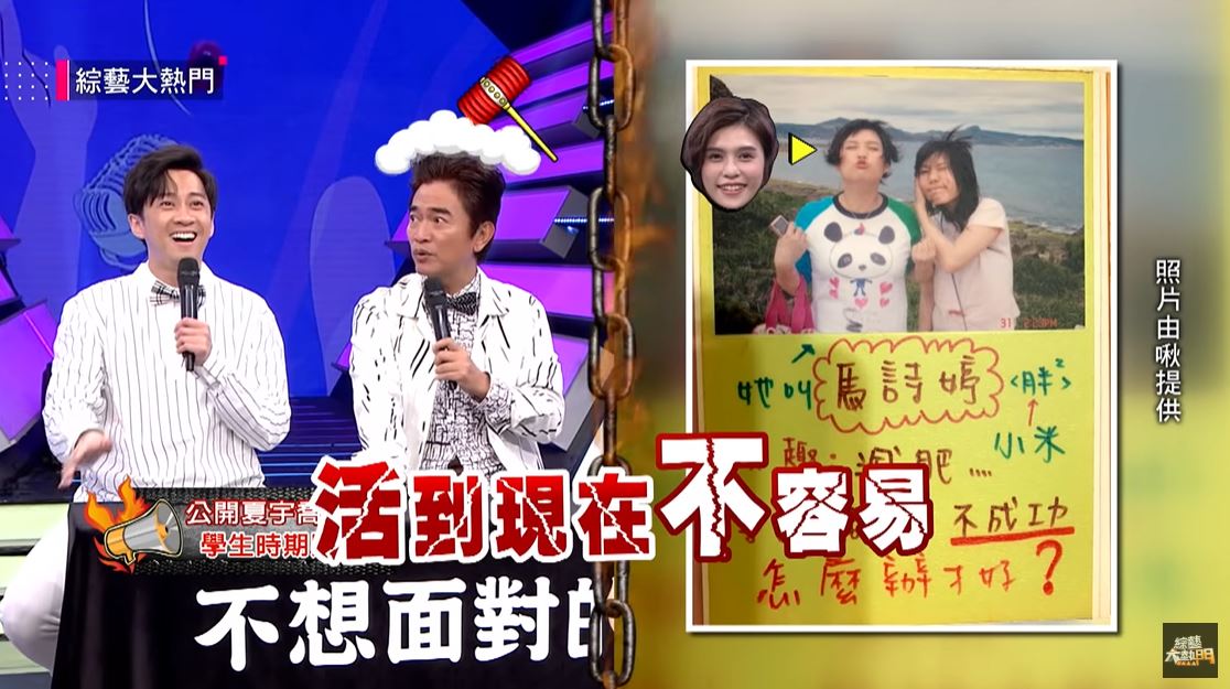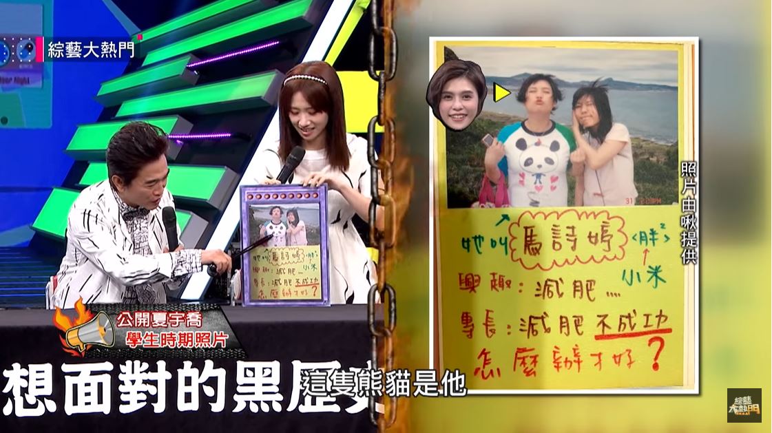 在最新一集的《綜藝大熱門》中,找來了五位女嘉賓以及她們的同窗好友,而首位登場的便是「夏宇童」,而她神祕的高中同學一出場就直言「她高中時候跟現在完全不一樣」,接著,主持人LULU也拿出了「夏宇童」高中時期的照片,照片中的夏宇童身穿一件熊貓T恤,體型看起來圓圓胖胖的,比起一旁的同學顯得稍微壯碩了些,而照片一出就讓眾人紛紛驚呼「熊貓是你嗎」「這個是夏宇童?」「完全長得不一樣耶」,而「夏宇童」更是崩潰地怒喊「是誰?裡面那個人到底是誰!」。