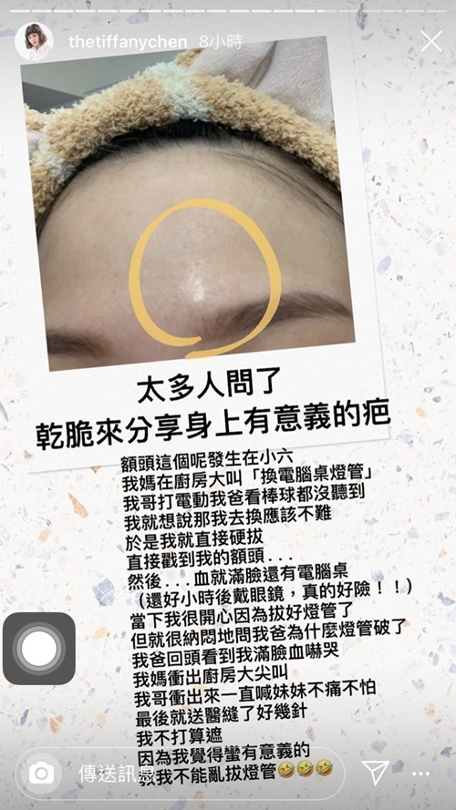 日前彥婷在限時動態中,大方分享自己身上「有意義的疤」,首先她先提到最容易看見的額頭上疤痕,彥婷小六時曾自告奮勇換燈管,沒想到她硬拔之後直接戳到額頭,當時血流滿面,嚇壞家人,最後送醫縫了好幾針,然而這個傷疤彥婷也不刻意遮掩,認為疤痕教會她「不能亂拔燈管」十分有意義。