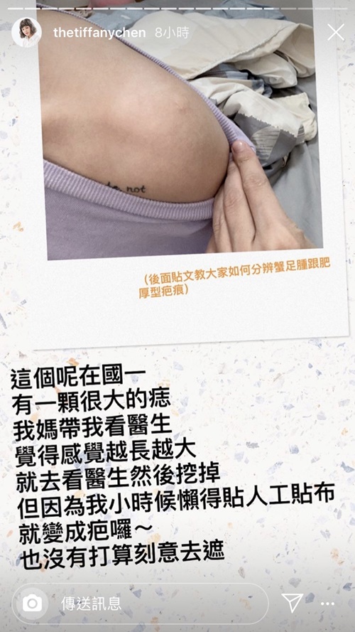 接下來彥婷分享就讀國一時,肩上曾有一顆很大的痣,覺得它越長越大,因此請醫生幫忙挖掉,但術後未好好照顧傷口,因此也留下一個疤痕。