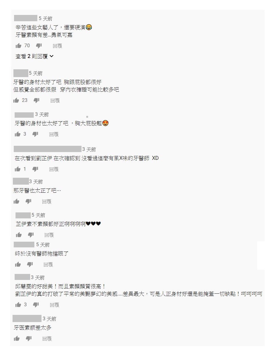 儘管平常給人的冷豔氣勢不再,但仍有不少網友稱讚「劉芷伊」的好身材,直呼「牙醫的身材太好了吧!胸跟屁股都很好」「那牙醫也太正了吧⋯」「芷伊素不素顏都好正啊」「人正身材好還是能掩蓋一切缺點!」。