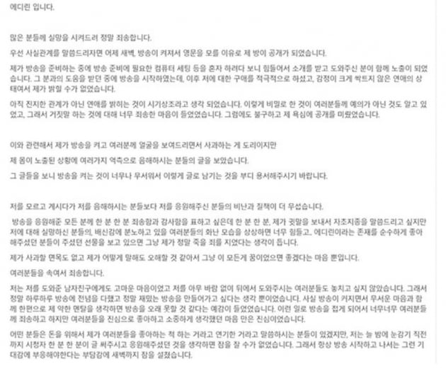 南韓實況主edoongs2(에디린)因為擁有甜美外貌和傲人上圍,時常在直播中穿著清涼引起大批粉絲關注,然而她近期卻一連陷入負面消息,9日,edoongs2更因為忘了關閉鏡頭,意外全程直播洗澡後和男友同樂的畫面,10日下午,edoongs2透過部落格發布聲明,除再三道歉也正式宣布「退出直播圈。」引起外界一片譁然。