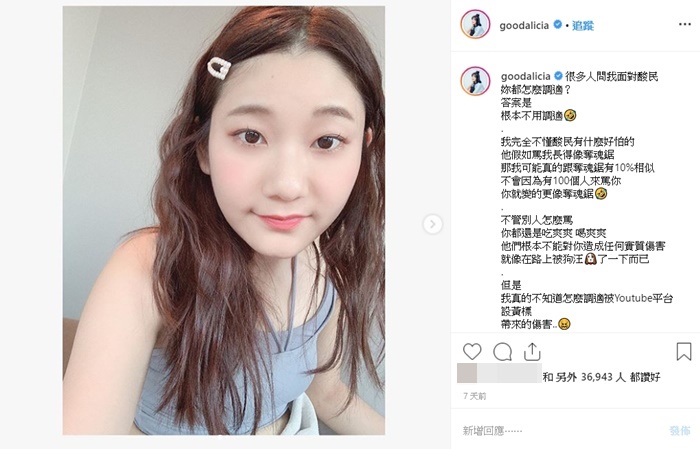 網路上負評一次次襲來,愛莉莎莎面對酸民也有一套,她曾在自己的IG貼文中說到,「不管別人怎麼罵,你都還是吃爽爽、喝爽爽,他們根本不能對你造成任何實質傷害,就像在路上被狗汪了一下而已。」
