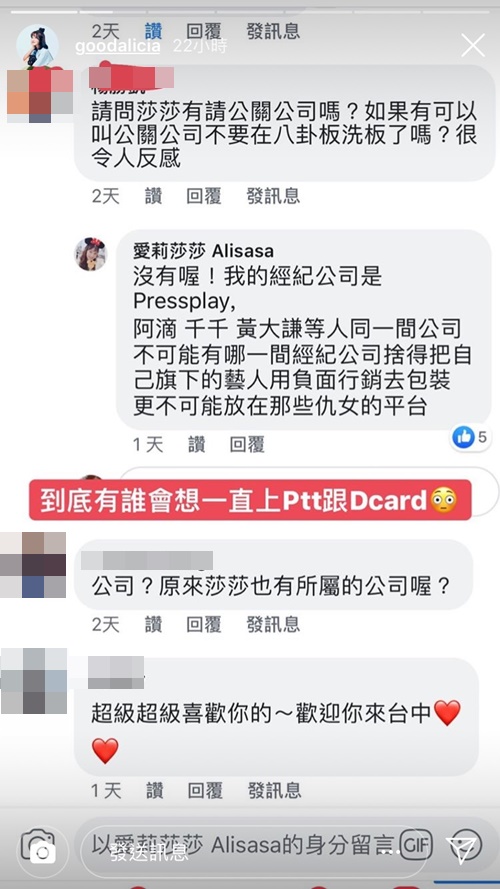 日前有粉絲在愛莉莎莎的粉專上詢問,「請問莎莎有請公關公司嗎?如果有可以叫公關公司不要在八卦版洗版了嗎?很令人反感」。收到網友的質疑,愛莉莎莎親自回應表示,自己的經紀公司是「Pressplay」,和阿滴、千千等人是同一間公司,「不可能有哪間經紀公司捨得把旗下藝人用負面行銷去包裝,更不可能放在那些仇女的平台」。
