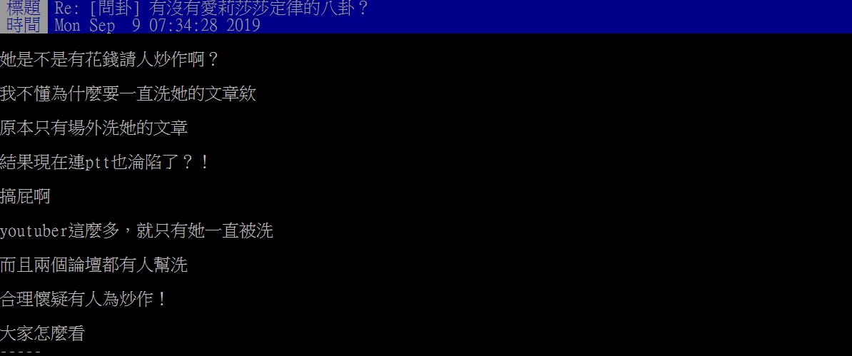 實際在PTT八卦版上搜尋「愛莉莎莎」可以看到,每天都一定有人發文討論,一天最少兩篇,然而這些文章中,許多都由同一人的帳號發出,因此也讓不少網友是愛莉莎莎「花錢炒作」!如今,愛莉莎莎親自證實非她操作,更在限時動態上表示,「到底有誰會想一直上Ptt跟Dcard」。