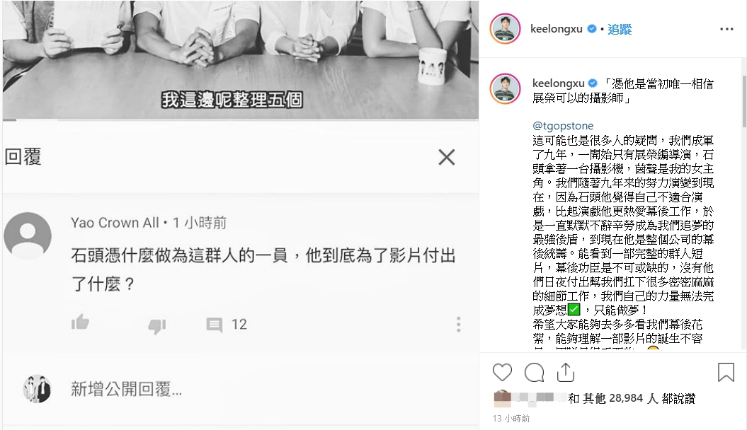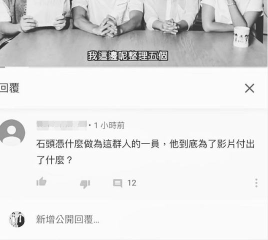近日有網友在這群人的YouTube頻道留言,表示「石頭憑什麼作為這群人的一員,他到底為了影片付出了什麼?」讓團長展榮直接在IG上發文回應「憑他是當初唯一相信展榮可以的攝影師」,展榮還進一步表示,一開始只有石頭拿著一台攝影機,由茵聲當女主角,經過九年來的努力才演變成現在的這群人,並透露因為石頭他覺得自己不適合演戲,也更熱愛幕後工作,所以總是扮演後盾的角色支持這群人,一直到現在擔任整個公司的幕後統籌。