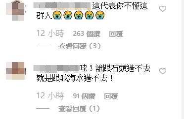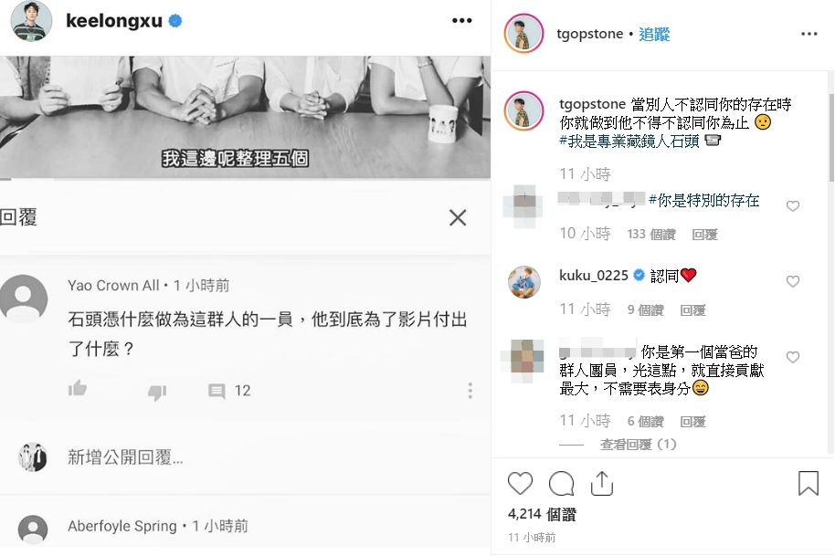 對此,石頭也發文回應「當別人不認同你的存在時,你就做到他不得不認同你為止,我是專業藏鏡人石頭」,兩人的發文一出,不少老粉留言「這代表你不懂這群人」、「哇!誰跟石頭過不去就是跟我海水過不去!」、「可能是半路才殺進來的粉絲吧」,也引來團員留言力挺,除了董仔逗趣表示「沒有石頭沒有群人(因為就沒人拍我們)」之外,木星也表態「石頭我師傅,徒弟愛你」。