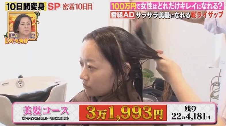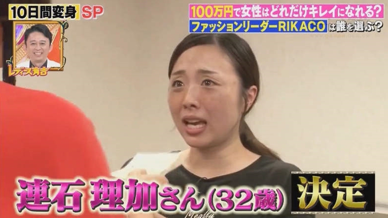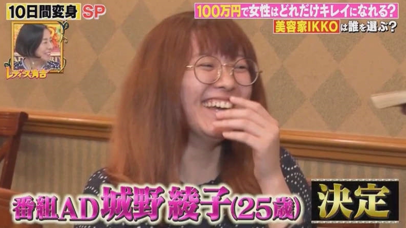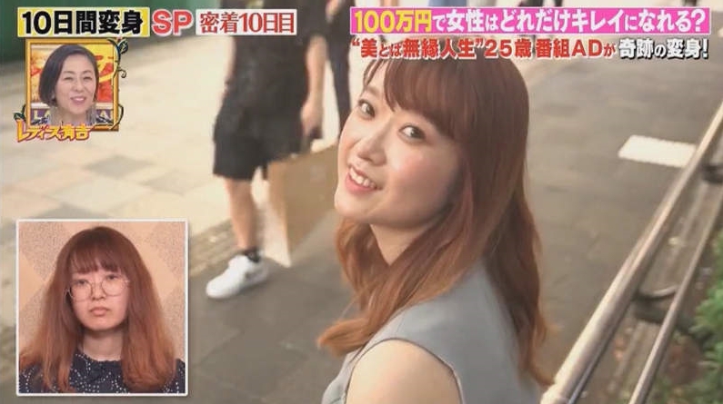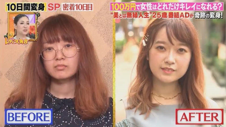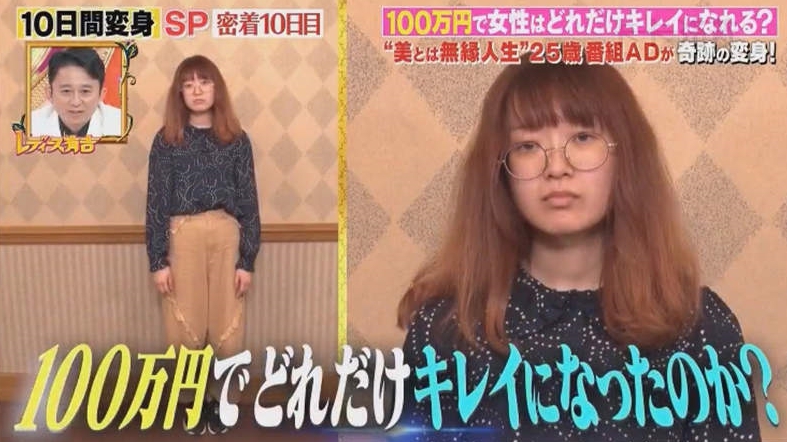日本綜藝節目「レディース有吉」最近在9/3的節目上,通過選拔挑出兩位女性,分別是25歲的女導播以及32歲家庭主婦參加十天內變美大企劃,節目製作組各自給她們100萬日圓(約台幣30萬元)絲毫不干涉的情況下自行使用,就是要觀察這兩位似乎跟「正妹」這兩個字談不上關係的人,究竟能夠變美到什麼地步!