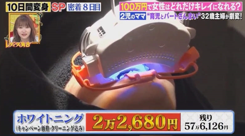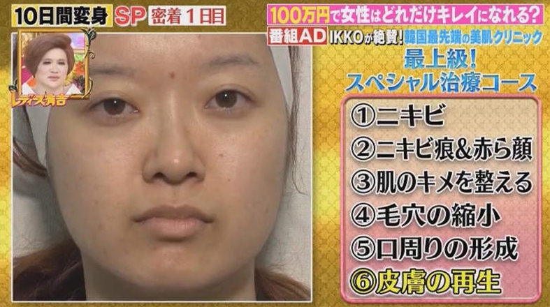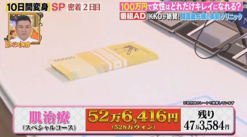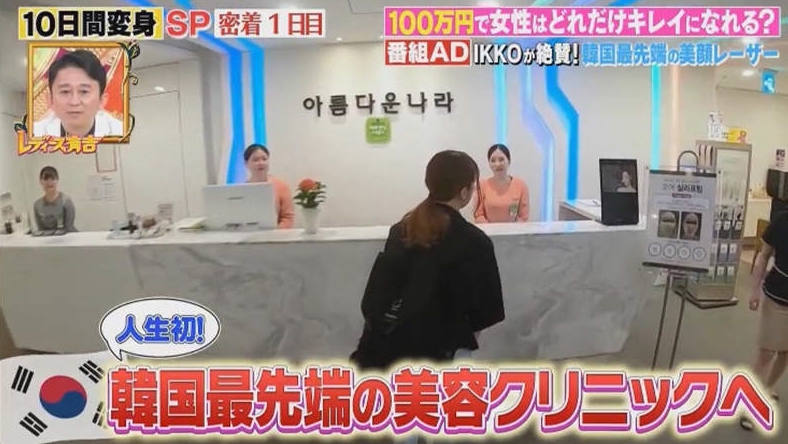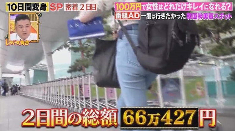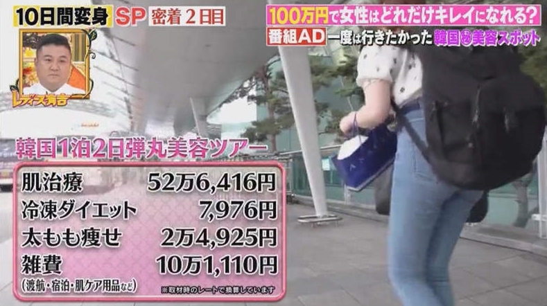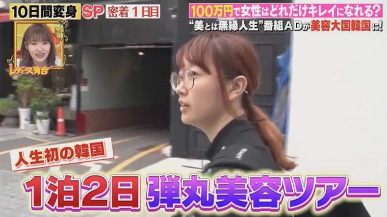 25歲的邋遢女導播,一拿到錢二話不說直接飛去韓國,即使100萬日圓(約台幣30萬),做不了昂貴的大整形手術,她還是選擇可以做「治青春痘、緊緻毛孔和重塑皮膚」的超高級全套醫美療程,不僅打了雷射,還有超音波跟按摩!光是這一整套療程,就耗費52萬日圓,花了一半的資金。但她沒有停下腳步,繼續在韓國做美容療程:冷凍解肥、按摩瘦大腿。這趟韓國改造之旅加上機票和雜費,就噴掉了66萬日圓。回到日本後,邋遢導播將所剩不多的錢也都花在美容療程上,不過她可沒有忘記連頭髮也要變美,經過十天的淬鍊和改造,邋遢導播的轉變讓攝影棚所有人大吃一驚,整個人都煥然一新!