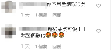照片一出,粉絲不禁紛紛留言大讚「你不用色調就很美」、「怎麼調都很美」、「超級甜美可愛!!我整個融化」、「白色比基尼你駕馭得很好,特別美」,更有粉絲撩她:「有一種顏色是怎麼調都好看的,叫做妳的美色」、「妳的美,是出生的時候就調好的,不用擔心」。