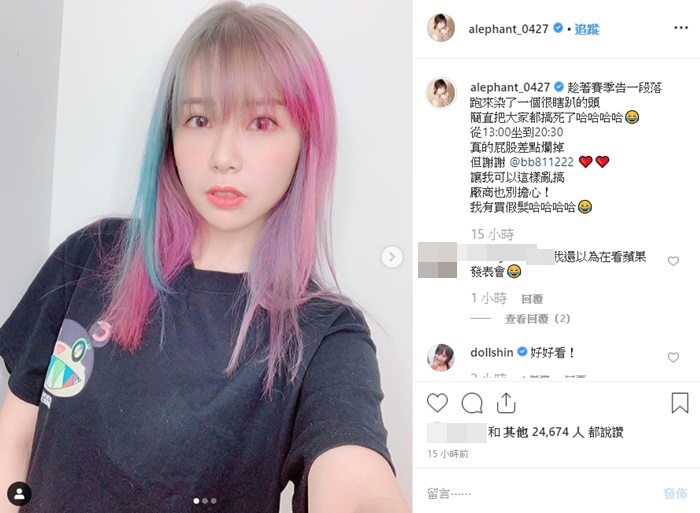 阿樂日前在IG分享最新染髮照,只見照片中頭髮顏色除了粉色、紫色以外,右邊還挑染一戳藍綠色,顏色十分亮麗豐富,給人夢幻不真實又帶點中二的感覺,完全突破阿樂以往的形象!