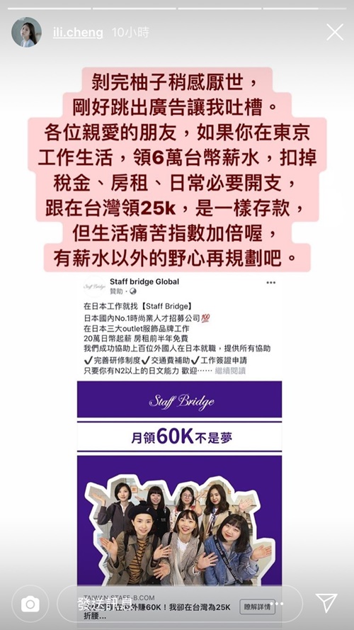 雞排妹日前在限時動態中貼出一張截圖,內容為某人才招募公司的廣告,上面寫著大大的「月領60K不是夢」,令大眾認為透過該公司到日本工作,高薪就不再是夢想,而此招募廣告讓雞排妹一看到便忍不住發文吐槽!
