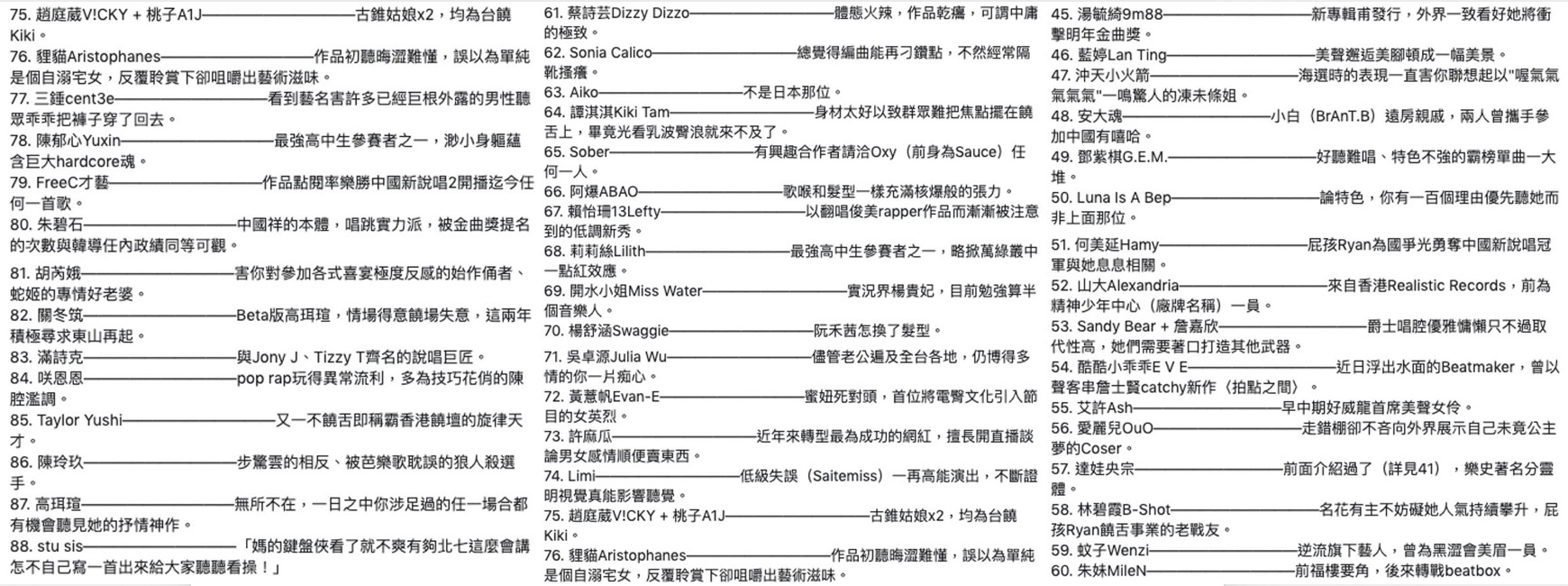 台灣網路神秘樂評人「stu sis」時常饒舌歌曲下方留下一針見血的犀利評論,像是他曾在上一季《中國新說唱》每集播出後,都會留下自己獨到的見解,有時嘲諷有時幽默,深得網友們的好評,除此之外他也時常分享五花八門的排行榜。然而這次Stu sis再度發布「私藏花名冊」,他將88位華語饒舌圈歌手們進行排名,這次的排名也跌破眾人眼鏡。
