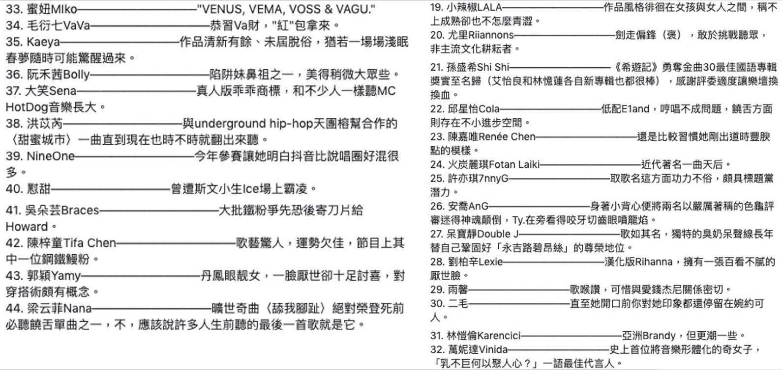 接下來為大家揭曉第 44 名到第 1 名的饒舌歌手中包含了許多知名選手,其中前年參加《中國有嘻哈》爆紅的 VAVA 得到第 34 名的位置, Stu sis 也不忘趁機調侃她:「恭習 Va 財,"紅"包拿來。 」此外也有許多《中國新說唱》女選手們,包含:萬妮達、劉柏辛、呆寶靜、蜜妞、Nineone…也都紛紛上榜,而在節目中獲得許多討論的「沖天小火箭」更是位居第47名,跌破眾人眼鏡,而蜜妞則位居第33名。再者是號稱「饒舌界鄧麗君」的葛仲珊 Miss Ko 榮獲第二名,值得一提的是 Stu Sis 給她的評價相當有趣:「陽剛味甚濃,自封饒舌鄧麗君但比較像嘻哈蔡琴。」