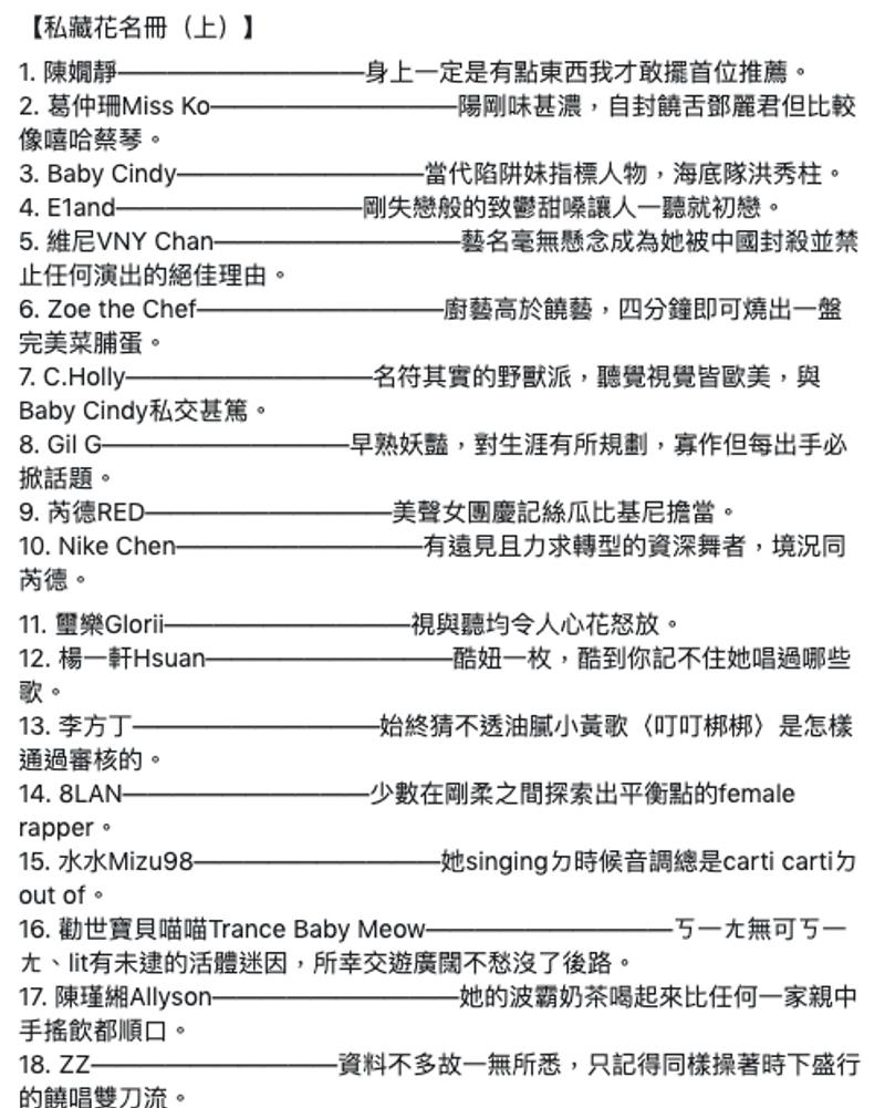 也因為 88 位饒舌歌手實在是太多,所以 Stu Sis 還貼心地幫網友們分成上下兩篇,其中Stu sis和鄉民們的最愛「Julia吳卓源」居然只有 71 名的名次,讓不少網友們跌破眼鏡,認為她被低估了應該要在前十名才對。接下來是前一陣子發布新歌《差不多姑娘》的鄧紫棋則獲得「好聽難唱、特色不強的霸榜單曲一大堆」的評語,獲得第 49 名的位置。