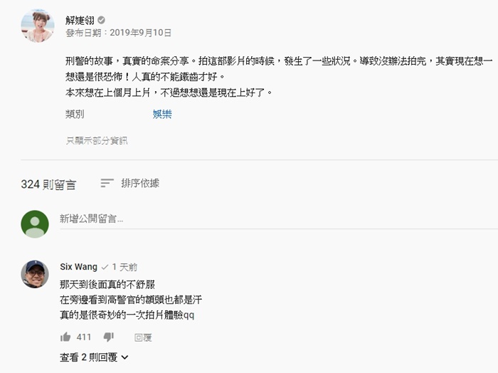 解婕翎最新一集影片當中,除了有實況主「6 tan」,解婕翎還邀請到曾主辦許多重大案件的「高仁和」警官當嘉賓。高警官大方分享許多當年辦案時發生的離奇巧合,令解婕翎和6 tan聽到全身發毛,甚至三人最後還因身體不舒服而結束拍攝。