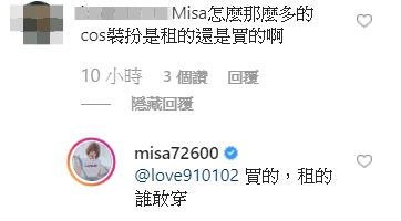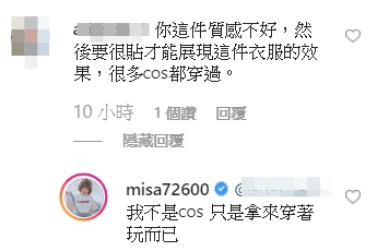 但也有對Cosplay較有研究的網友針對她的衣服發表評論,表示「你這件質感不好,然後要很貼才能展現這件衣服的效果,很多cos都穿過。」,讓米砂也親自回應「我不是cos ,只是拿來穿著玩而已」,另外也有一名網友疑惑「Misa怎麼那麼多的cos裝扮,是租的還是買的啊?」讓米砂笑稱「買的,租的誰敢穿」。