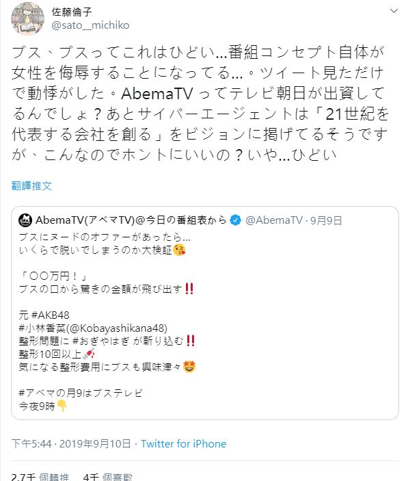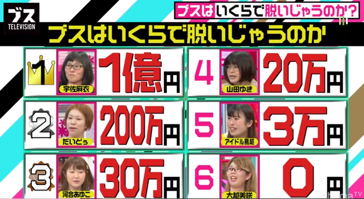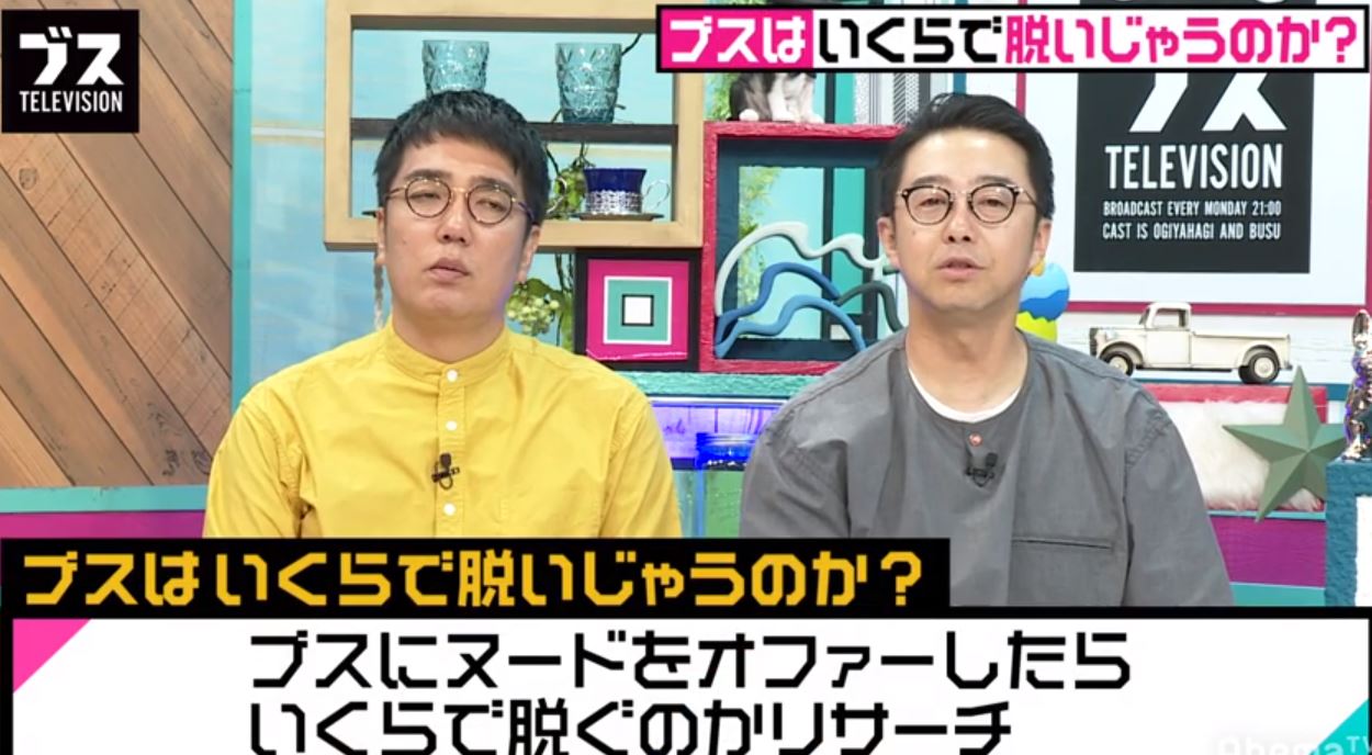 日本網路電視台AbemaTV播出的節目《おぎやはぎの『ブス』テレビ》,有多位被設定是「醜女」的路人和女明星常駐節目,而9日,播出的最新一集主題為「全裸醜女How much?」,節目邀請雜誌社員詢問「醜女」願意以多少價碼拍攝全裸寫真,並將金額數目加以排行。