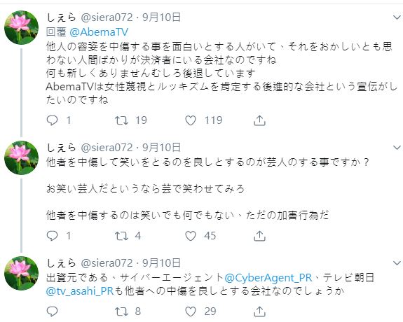 事實上,近年興起的AbemaTV是由網路遊戲公司和日本朝日電視台合作開設的網路電視,目的就是想顛覆傳統電視的節目內容,因此常可見到不少辛辣主題還能免費收看,然而該節目卻被指物化女性而引起大批網友興起拒看AbemaTV,並評論表示「用金錢來衡量人的尊嚴嗎?」、「無法創新只會倒退,不只歧視女性肯定還歧視外表吧」,也有專為女權辯護的律師轉分享貼文痛罵「節目概念本身就在羞辱女性,這間網路公司願景不是『創建21世紀代表的公司』嗎,這樣真的對嗎好可怕」。