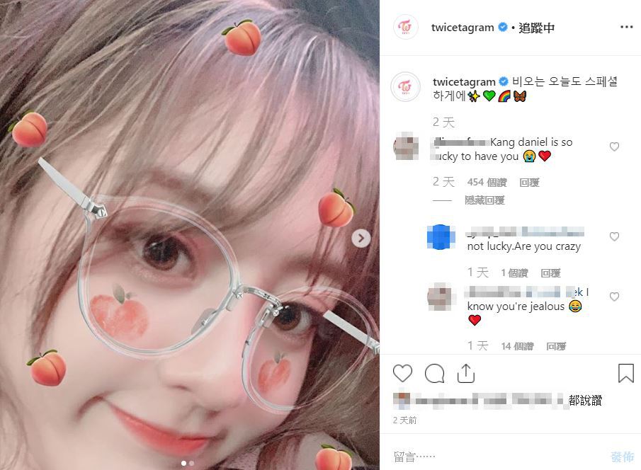 韓國男團前WANNA ONE成員姜丹尼爾和當紅女團TWICE的志效,8月雙方透過經紀公司承認穩定交往中,消息一出震驚外界更被稱是「最強偶像情侶」,由於雙方始終相當低調,就有不少粉絲透過蛛絲馬跡解讀成兩人傳愛證據。11日,志效也追上近期熱門的「蜜桃照」APP,碰巧男友姜丹尼爾的綽號就是「桃子」,因此就粉絲歪樓留言到「姜丹尼爾有你真好」。