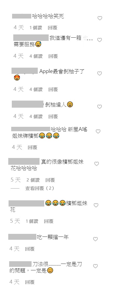 之後,姊妹倆也各自於自己的IG上PO出了這段影片和剝柚子的花絮照片,「Apple」更在貼文中逗趣地寫道「剝著剝著就變成檳榔姐妹花了!老闆~你要包葉還是菁仔?」,除此之外,還用心地附上了後製上「包葉、菁仔、雙子星」字樣的圖片,逗樂了粉絲們,大家紛紛留言表示「新屋A瑤姐妹牌檳榔」「哈哈哈哈笑死」「真的很像」「刀法很...一定是刀的問題,一定是」,為這個中秋佳節增添了更多的樂趣。