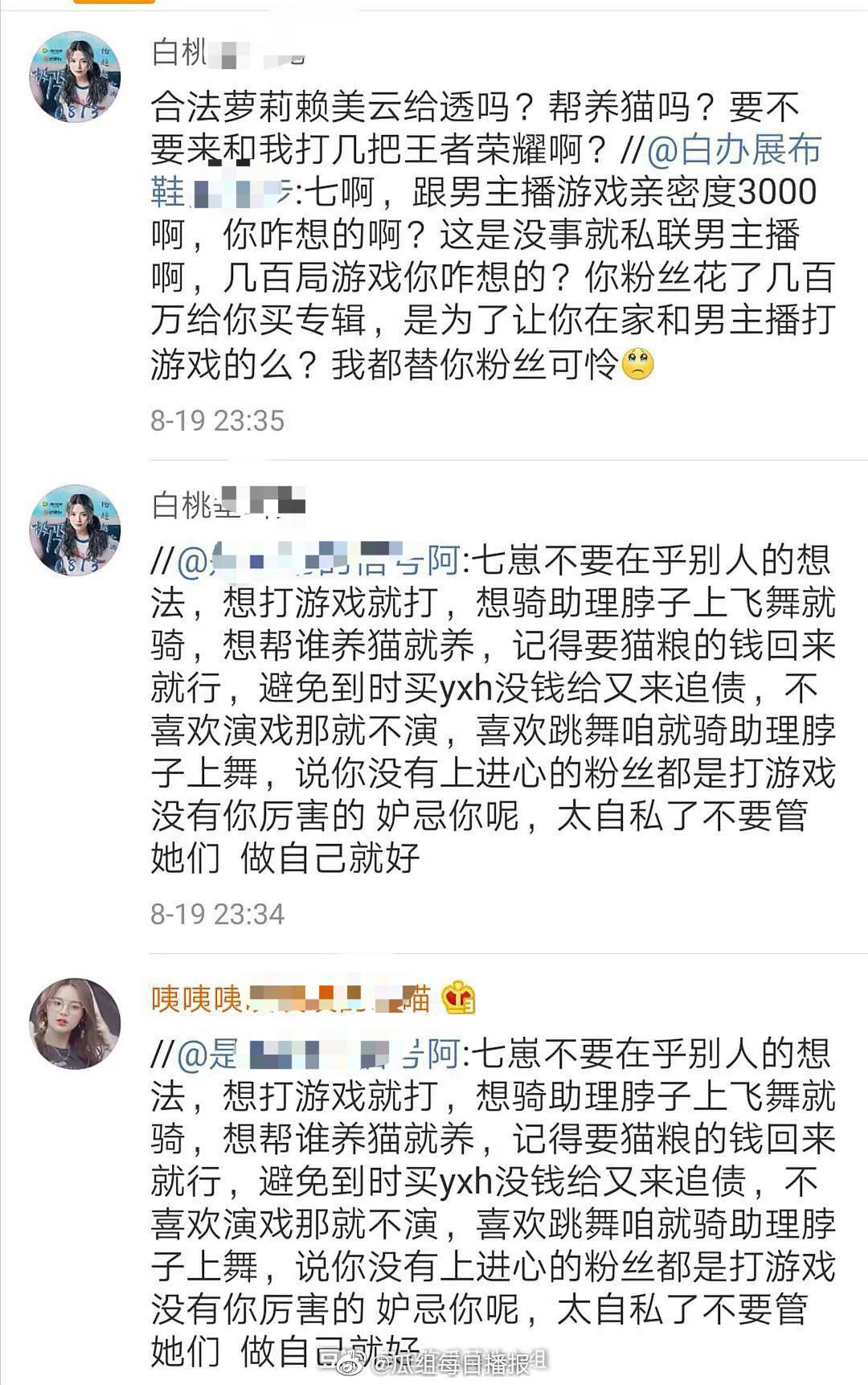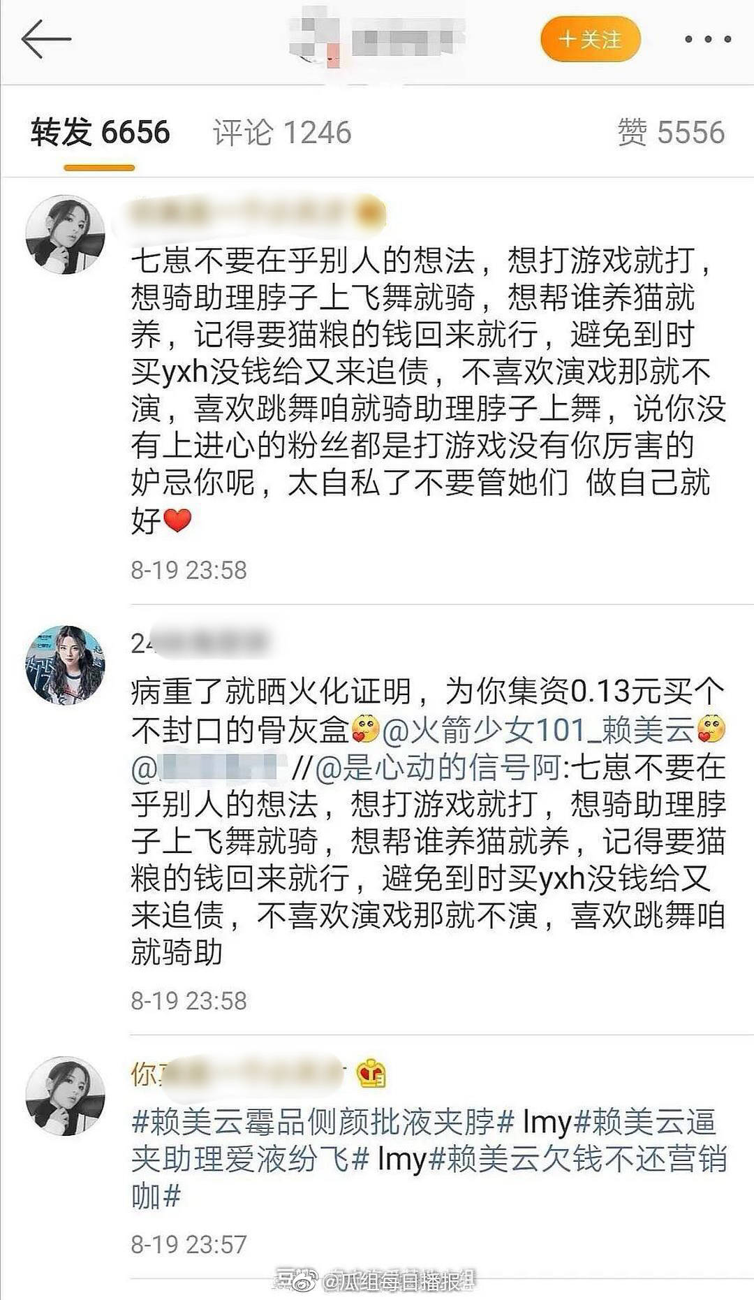 這些事導致楊超越的粉絲,失去理智的跑去賴美雲的小號微博底下留言,不僅酸她、諷刺她,更是辱罵她是神經病,並且希望她趕快。賴美雲也據傳因為身體狀態缺席好幾次活動,賴美雲的粉絲相當心疼地說:「楊超越的粉絲是打算把賴美雲逼死才算好嗎???」。然而賴美雲早在去年參加《創造101》出道後就曾傳出因為憂鬱症就醫的照片與消息,根據大陸媒體《網易號》指出去年7月7號時賴美雲和助理姐姐現身北京某醫院,兩人進入醫院後走進了心理科準備就診,在當時也被外界揣測是憂鬱症開始進行治療。