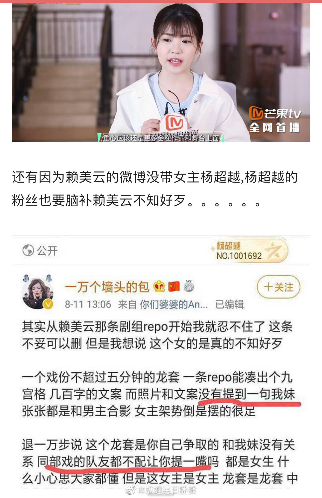 原因竟是和同團成員楊超越的粉絲有關,據說是有次採訪,賴美雲被問到:「接下來工作重心會偏向演戲嗎?」,她則回答:「我是覺得現在作為組合成員來說,重心還是更多會在作品和舞台上面」然而這個回答就被楊超越的粉絲記在心裡,認為賴美雲在暗指楊超越比起團體偏向於演戲,楊超越粉絲也發現賴美雲沒有在微博客串後記上提及到擔任女主角的楊超越......