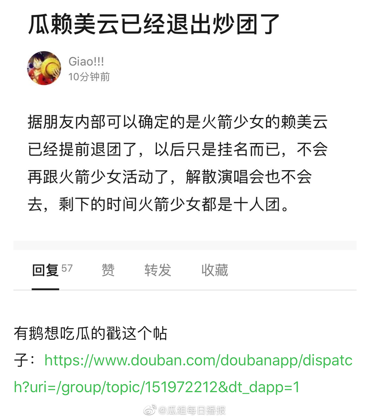 本月12日網上爆出一則消息,有網友指出賴美雲即將退出「火箭少女」,對此他表示:「據朋友內部可以確定的是火箭少女的賴美雲已經提前退團了,以後只是掛名而已,不會再跟火箭少女活動了,解散演唱會也不會去,剩下的時間火箭少女都是十人團。」