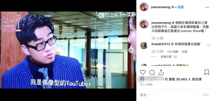 Joeman在客串片段播出後,也在IG上曬出各種「認證截圖照」,同時也承認看了自己的演出都笑到不行,並進一步分享之後在「Joeman Show」上會有完整片段跟幕後花絮,看來這次是要帶大家「開箱鄉土劇」啦!