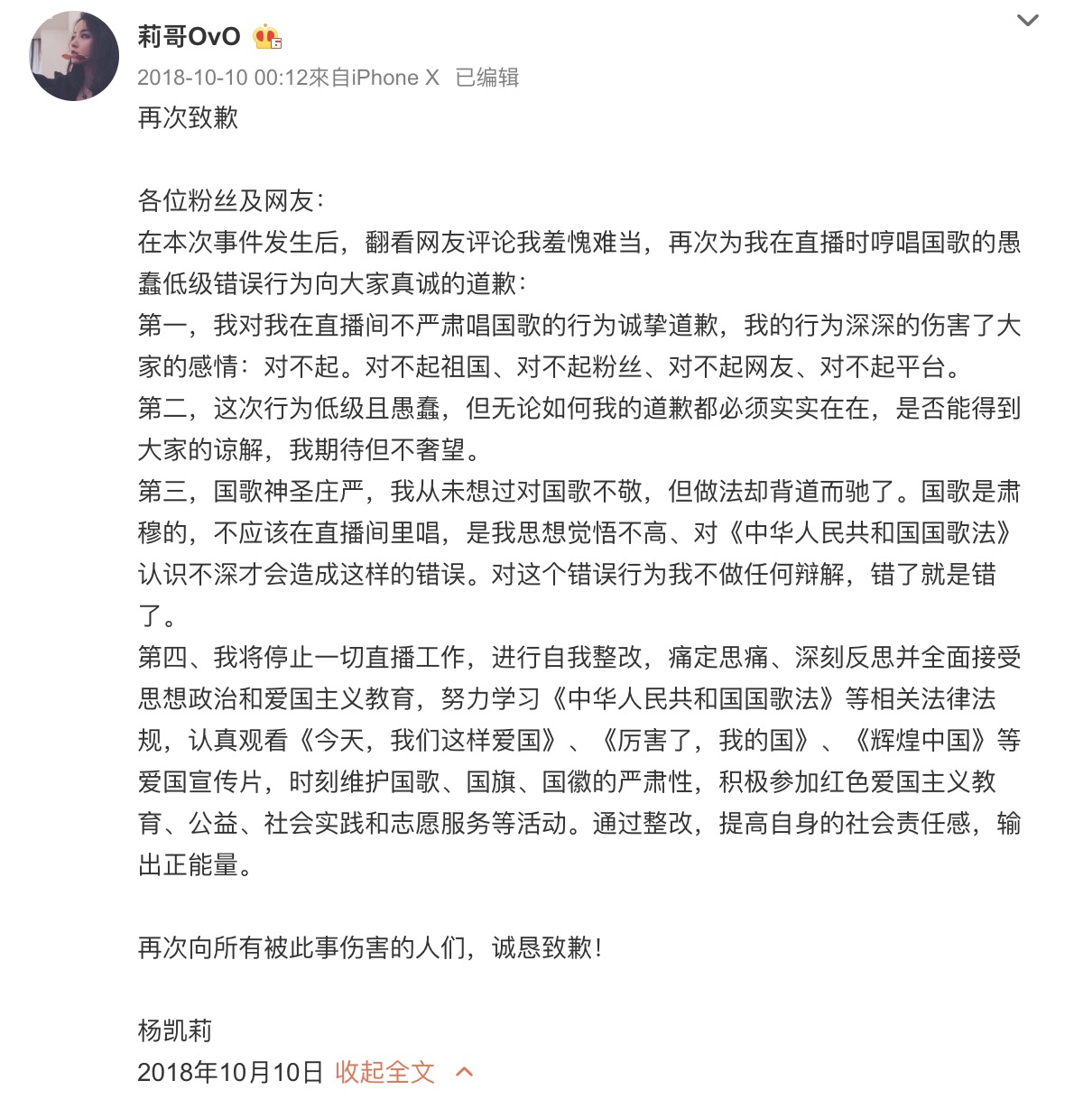莉哥過去在抖音平台上擁有3000萬的粉絲追蹤,更有個「莉三萬」的外號,因為據陸媒報導指出,莉哥在某直播平台上表示刷禮物有滿3000的話就可以加本人的微信好友。然而在去年10月7日時,莉哥因為「戲謔國歌」遭到網友檢舉,一星期後更以觸犯「國歌法」遭拘留5日,甚至遭到封殺包括莉哥的直播間、凍結直播帳號,過去作品都遭到下架,事後她也在個人微博上發文鄭重道歉,但自從該篇貼文後莉哥就沒有更新了,之後更傳出莉哥曾被虎牙平台高層「潛規則」,影片被全網瘋傳,種種負面消息曝光後也讓莉哥的名聲一落千丈。